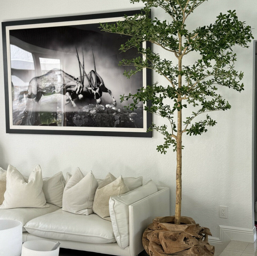 Embracing a minimalist aesthetic, this Shady Lady tree features an exposed trunk and sparsely placed branches, offering a refined and effortlessly stylish look. Standing at approximately 2.74 m in height, it is organically paired with a one-of-a-kind hand-carved teak planter, ensuring that no two pieces are ever alike. Each planter retains the unique character of the section of teak wood it was carved from, giving every piece a distinct personality and natural charm.